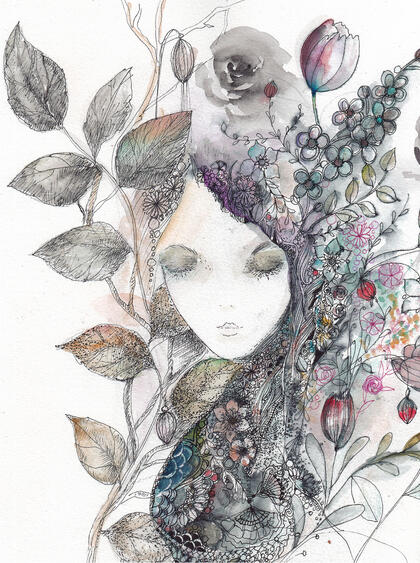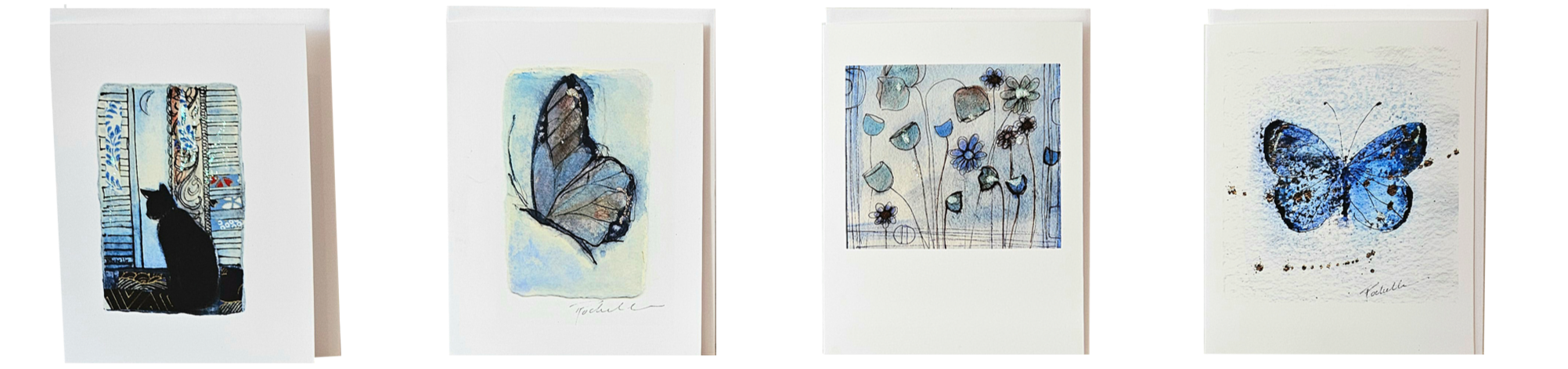 Her work is small, romantic, and ornamental reproduced from original drawings in pen, ink, and watercolour. Flowers, butterflies, birds and an array of familiar and charming cats are favourite subjects. Each piece is embellished with a few drops of iridescent glitter.